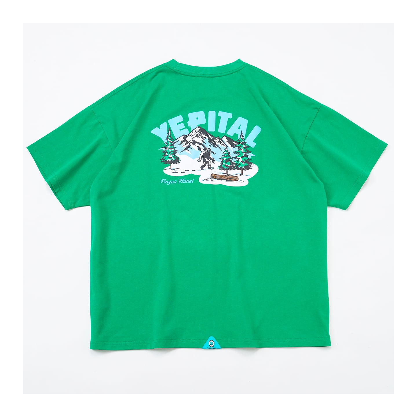 ・バックに雪積もる森を彷徨うYetiを施したTシャツ