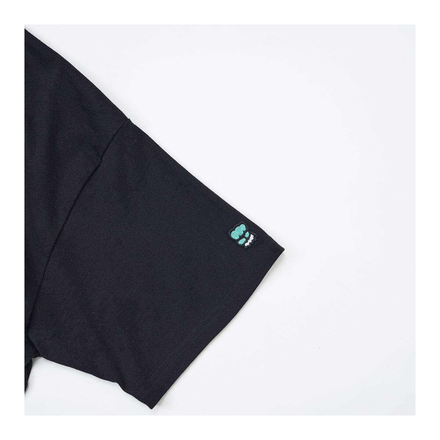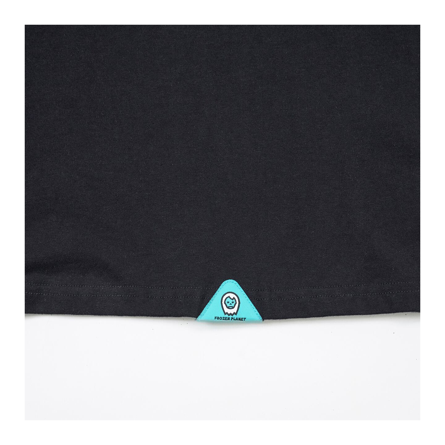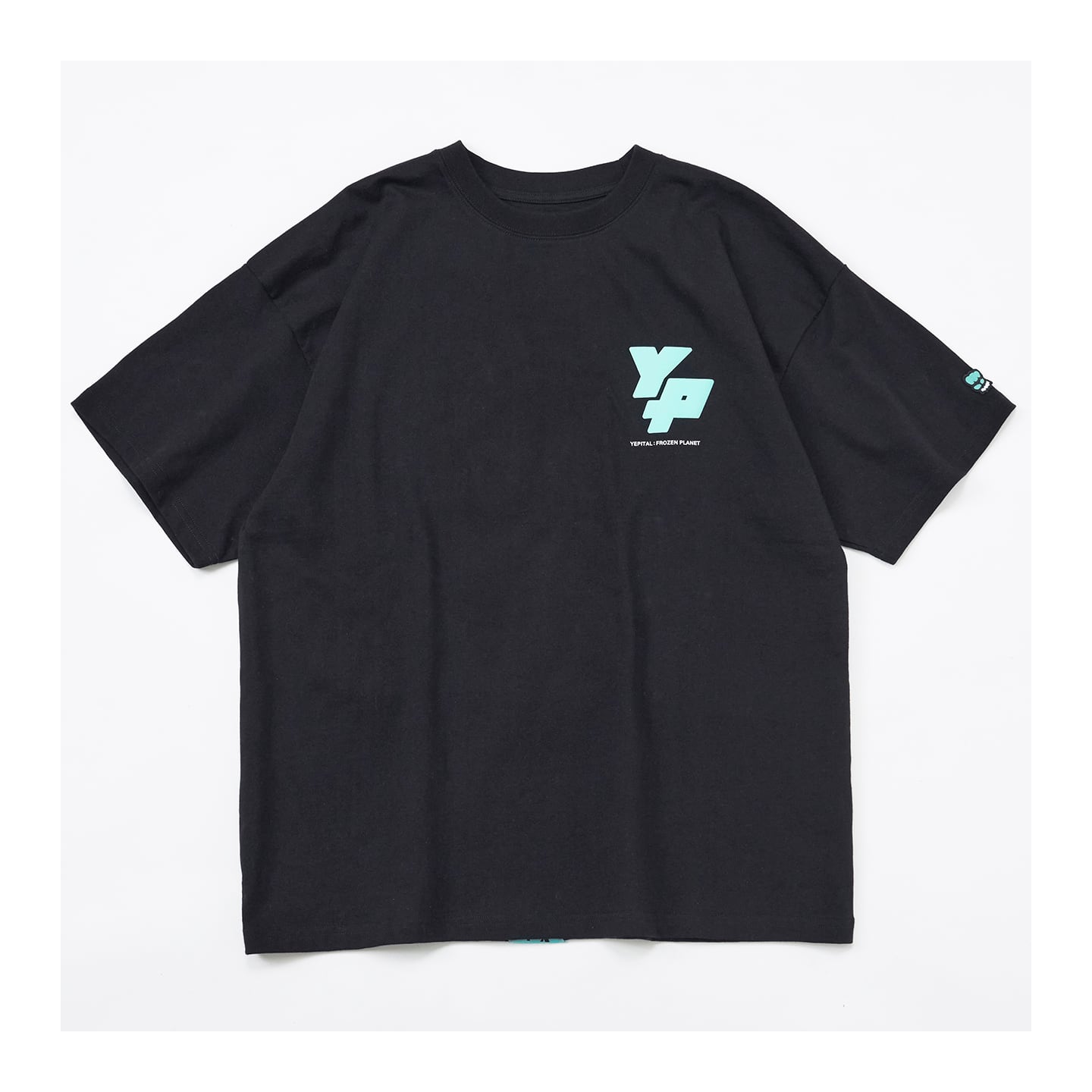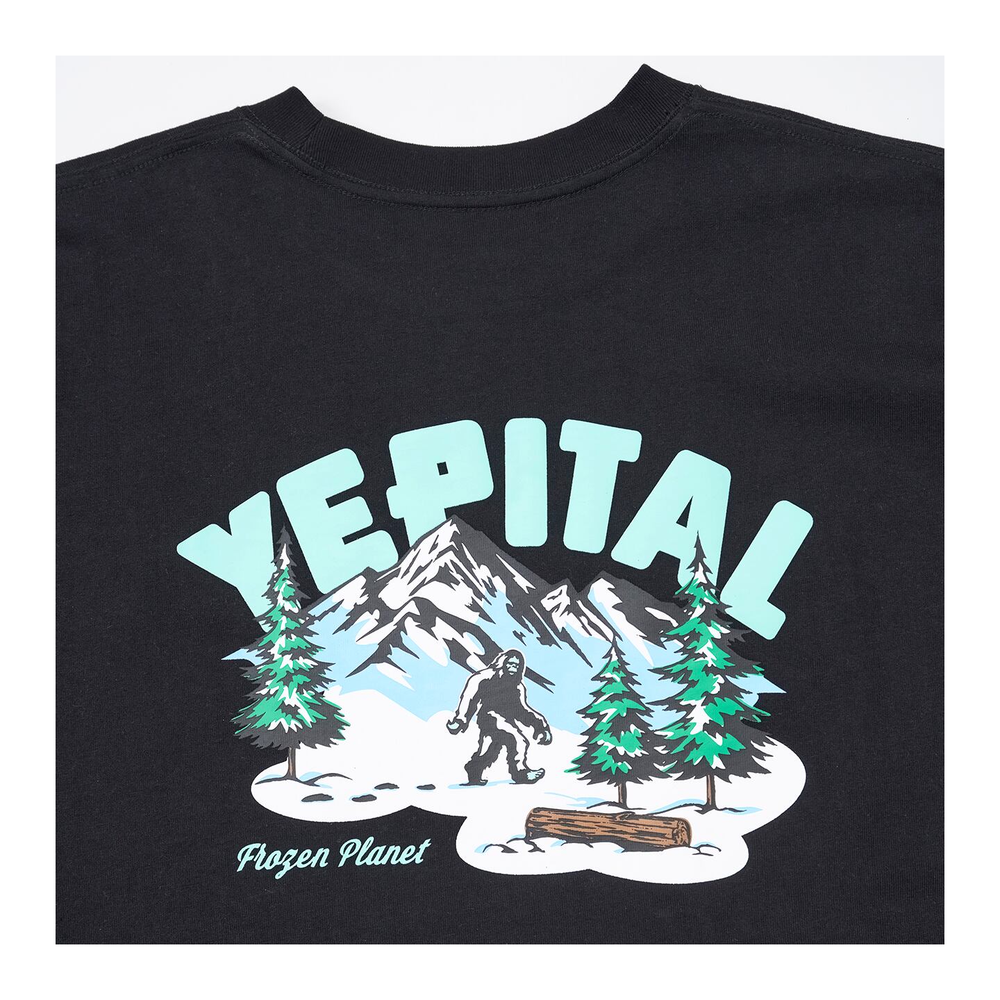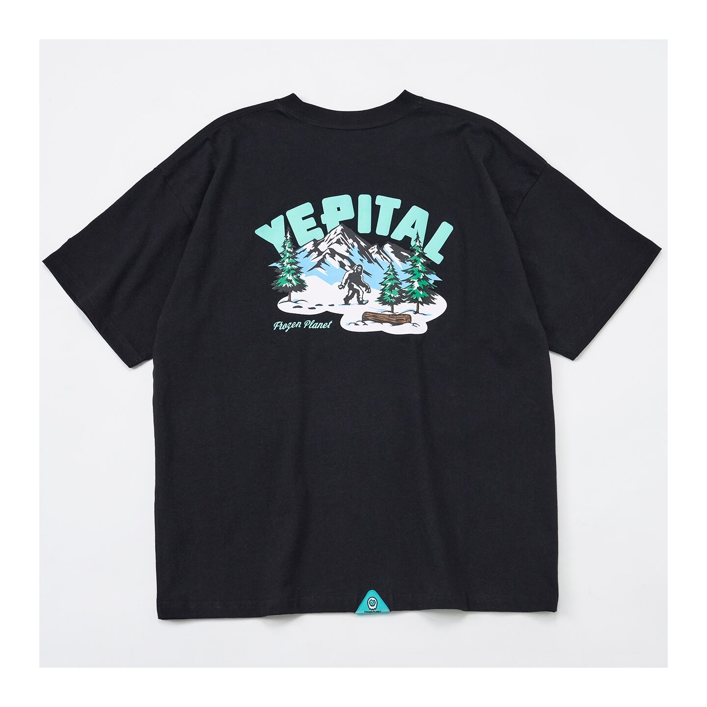 ・バックに雪積もる森を彷徨うYetiを施したTシャツ